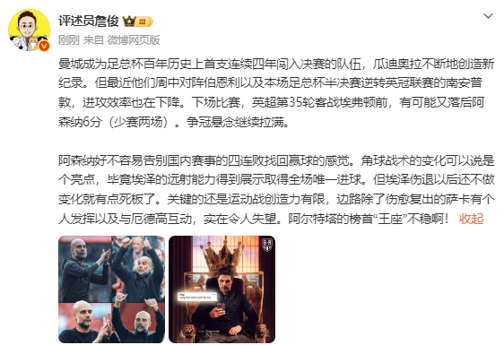 04月26日讯 今日凌晨进行的两场比赛,曼城淘汰南安普顿晋级足总杯决赛,阿森纳在联赛1-0小胜纽卡。赛后,评述员詹俊发文点评。